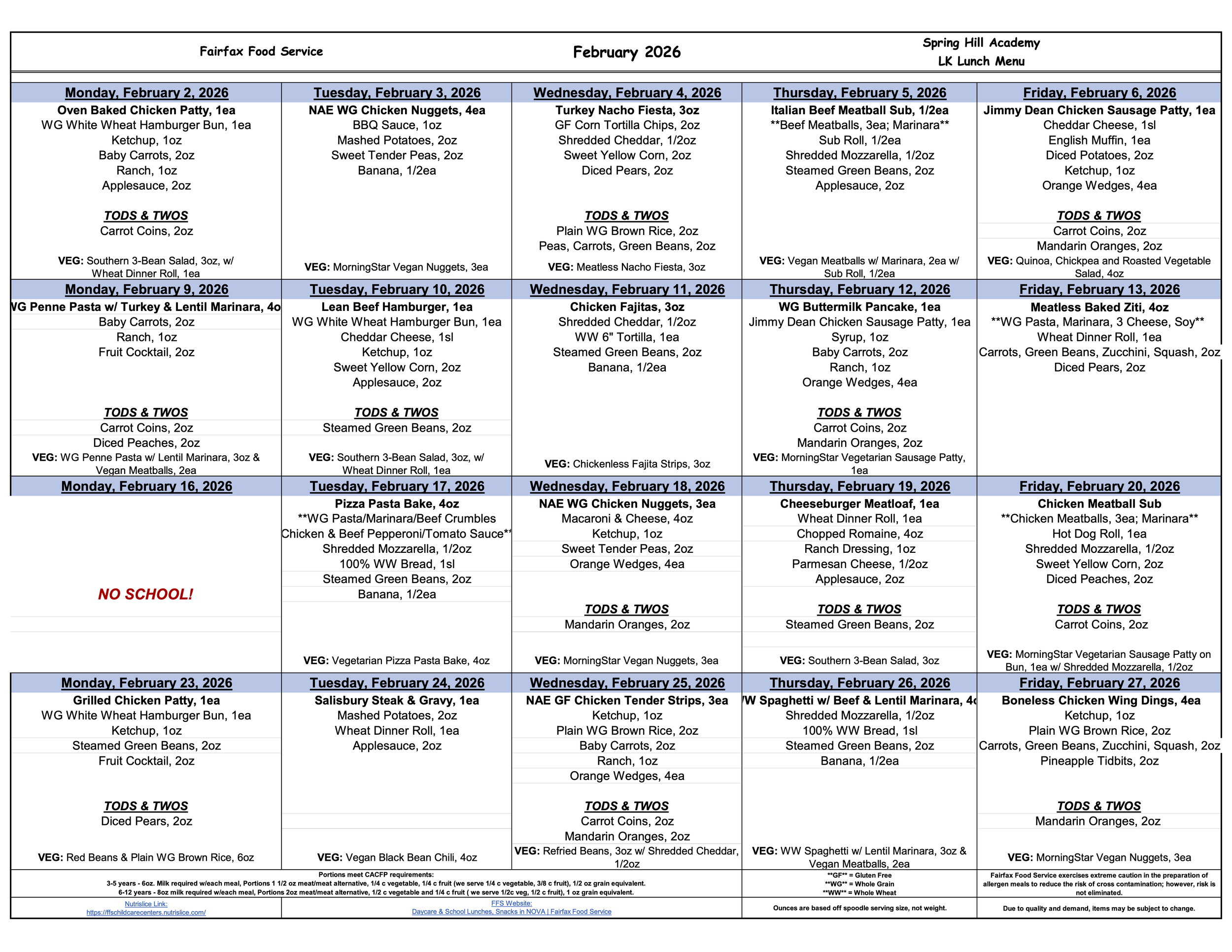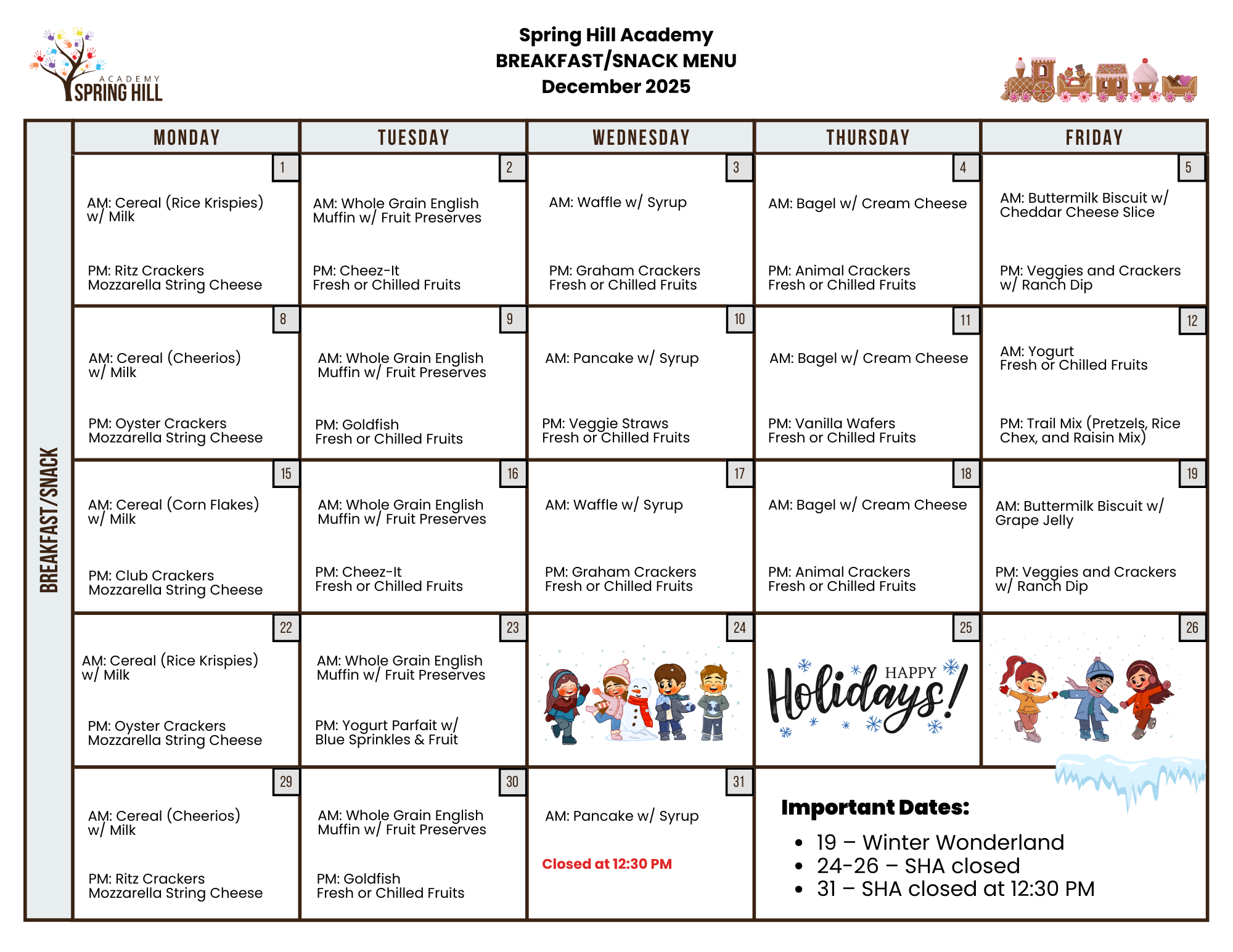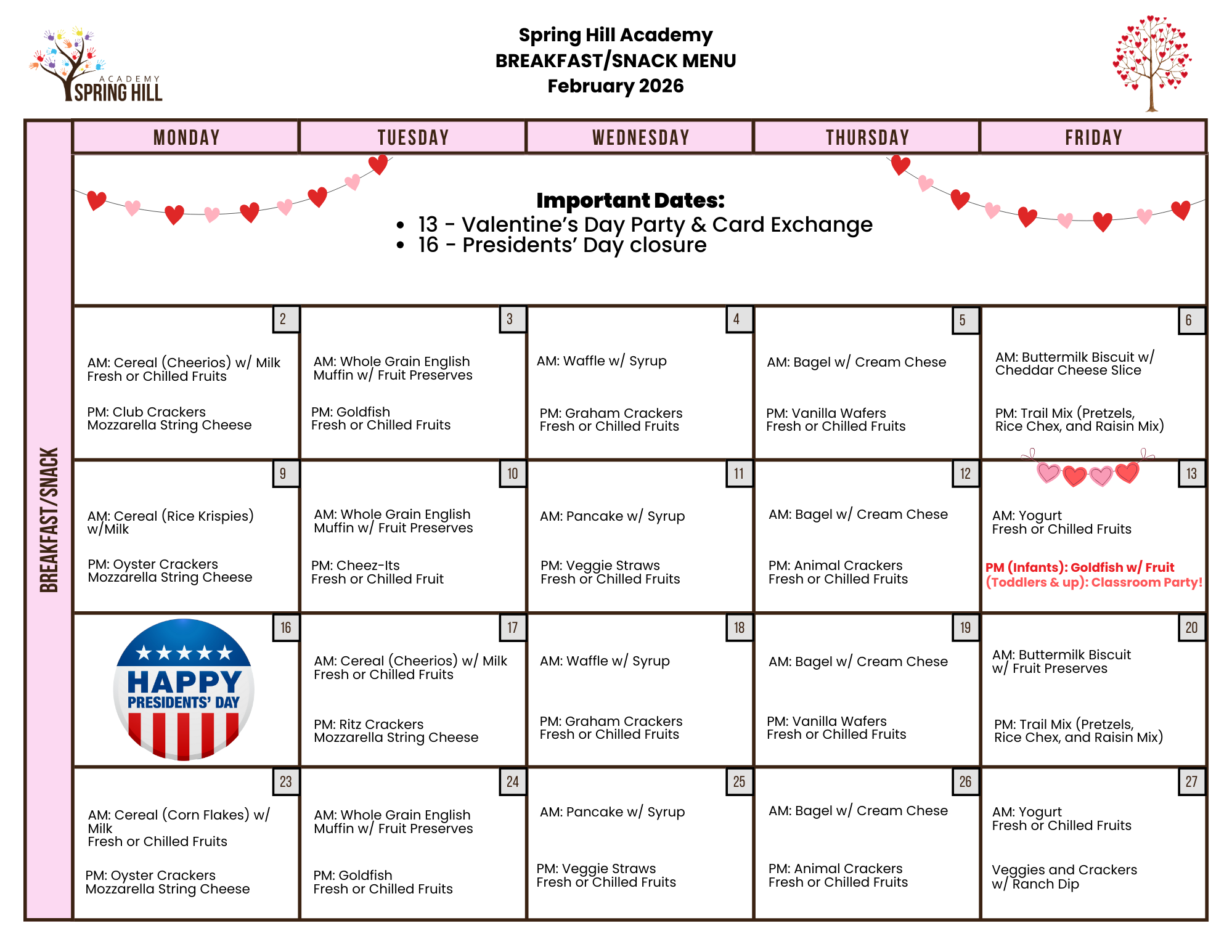 Spring Hill Academy is committed to providing a healthy and happy environment, which includes our meals and snacks! All our menus are USDA-approved and are included in our tuition rates. We are always nut-free (including all tree nuts!) and are happy to accept home-prepared meals in replacement for a meal where your child may be adverse or allergic to a particular item on the menu.